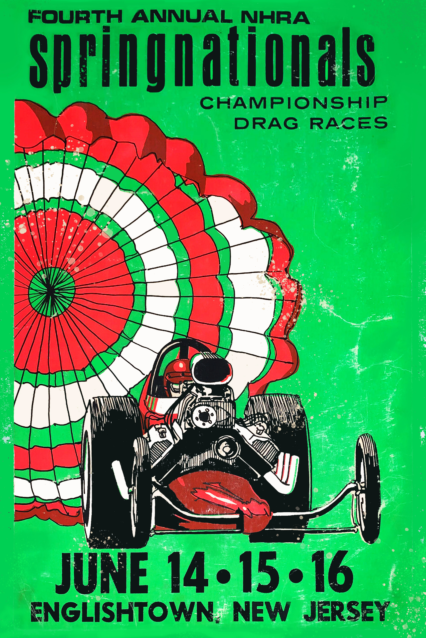 The NHRA Spring Nationals were only held at Raceway Park in Englishtown, New Jersey one time in 1968. That rare event is as rare as the promotional poster we were fortunate enough to find. We have reproduced it with its original aged, distressed condition as a 2-foot-by-3-foot (2’x3′) vinyl banner. You will not find this awesome piece of memorabilia anywhere else but from the creative artists at dragstripsgone.com.
